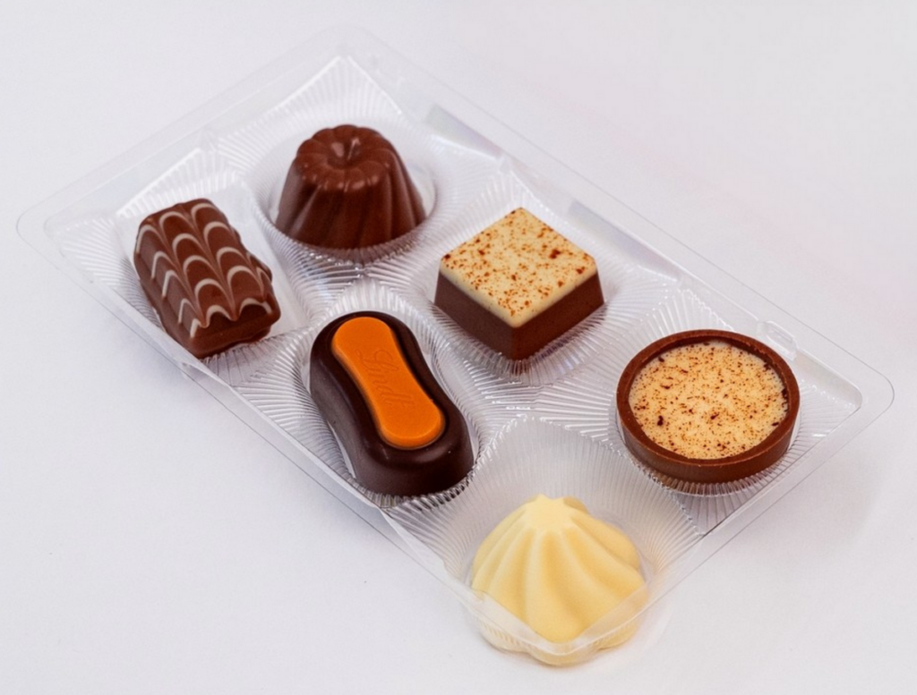 Chaque plateau comporte six alvéoles, dont les formes diffèrent selon chaque bonbon de chocolat.